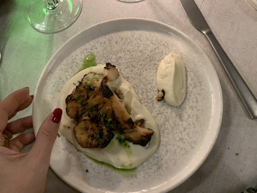 La ricerca della sostenibilità è evidente, nulla viene sprecato e ogni ingrediente è valorizzato al massimo, ma il piatto simbolo del menù, è sorprendente! È semplicemente il cavolfiore alla brace, un antipasto che riesce a conquistare anche i palati più scettici.