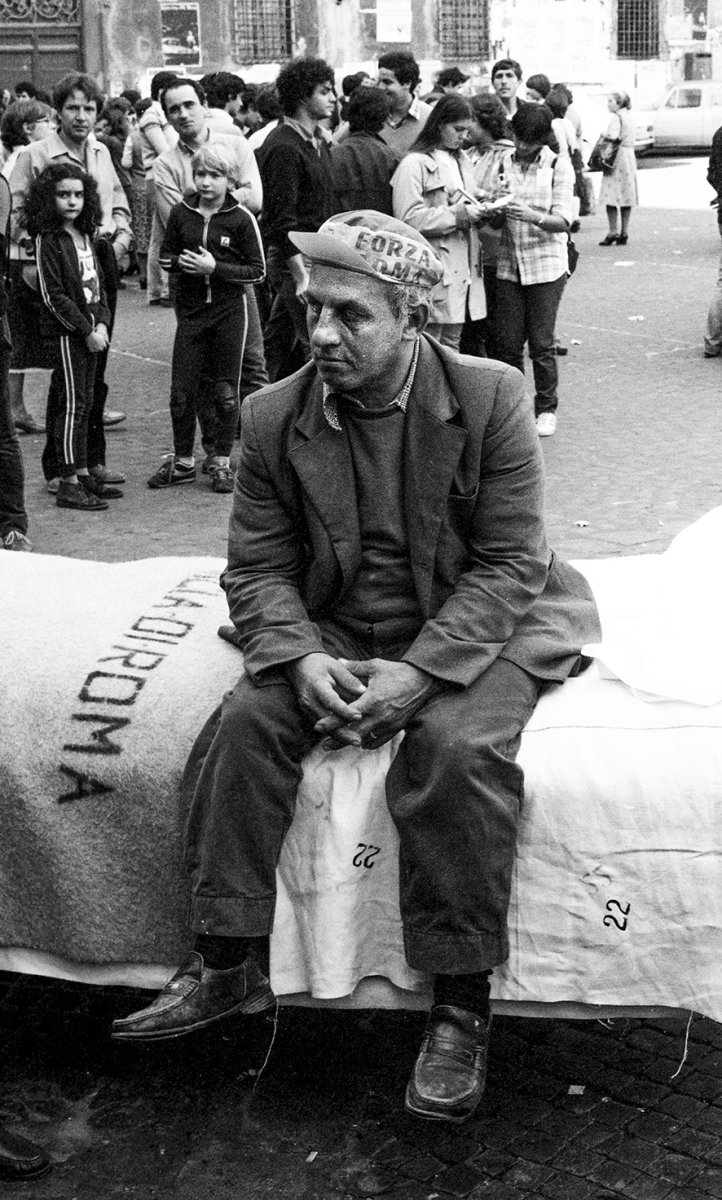 Al mattatoio, allo zoo, tra le rovine archeologiche, nelle borgate, nelle piazze del Centro Storico capitolino e alla Galleria Nazionale d’Arte Moderna si tentava di raffigurare e tracciare un percorso immaginario della riabilitazione, in cui gli ospiti delle ex strutture psichiatriche portavano con loro gli strumenti di coercizione come il letto di contenzione, la camicia di forza, l’elettroshock rendendo tutto manifesto al mondo di fuori. Nelle immagini di Confine # 1 Borelli a questo dato – una sorta di reportage suo peculiare – sovrappone la propria peculiare visione, la propria sensibilità, la sua cultura contaminata e quella fotografica restituendo fotografie potenti e con uno svolgimento sentimentale. Così, donne e uomini attraversano nelle foto, come attraversarono nella vita, una città ancora sospettosa o indifferente, animandola e rendendola consapevole. Riuscendo a portare e a farci vedere la luce in quell’ombra a cui si riferiscono i versi di Paul Celan («Dice verità chi dice ombra»).
